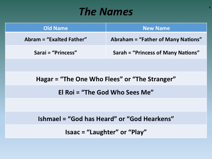 Let’s pause for a moment to look at names, using this chart. As I’d said, each name in this story is a metaphor, rich with meaning. You see here how the roles of Abram and Sarai expand from being the progenitors of one nation to being so for many nations, a point Paul picks up on in our reading from Romans.