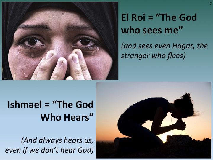 Also, Hagar’s name seems to be derived from an ancient Semitic word that meant “the stranger” or “to flee.” The angel confronts her after she flees; and Hagar responds by giving God a name, saying “You are El-Roi” – meaning “the God who sees me.”