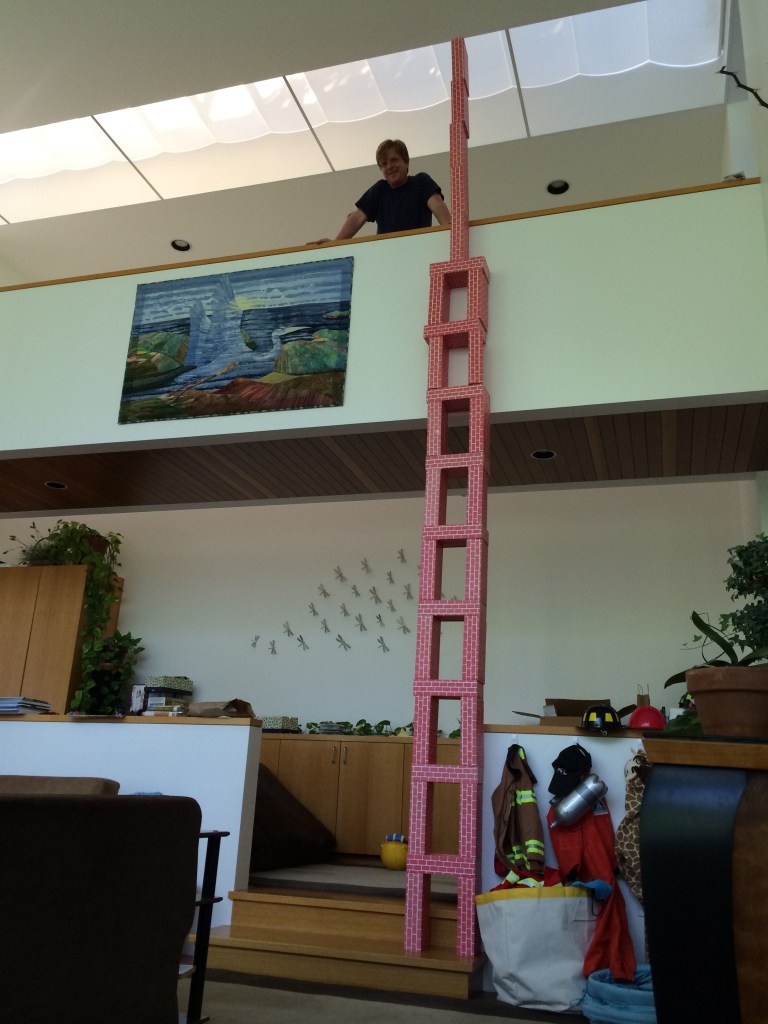 But our play was different. We had to build something. We had to have a goal. Our goal was to build the BIGGEST tower. So, we built a HUGE tower! We used every cardboard block. It almost touched the ceiling, nearly twenty feet above.